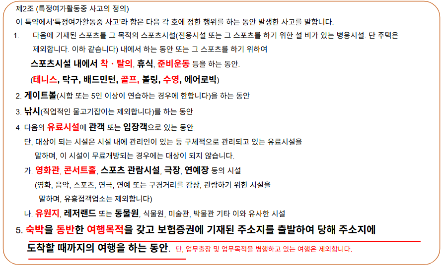 보험약관에서 정하는 특정여가활동 중 사고는 대체로 스포츠 시설 내부터 유료시설로 관객이나 입장객으로 있는 동안이나 숙박을 동반한 여행목적을 갖고 보험 증권에 기재된 주소지를 출발해서 도착할 때까지 여행을 하는 동안을 보장합니다.