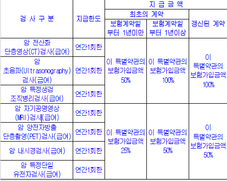 3. 보장받는 검사는 CT, 초음파, 특정생검조직병리, MRI, PET, 내시경, 특정단일유전자 검사를 받는 경우 보장한다.
