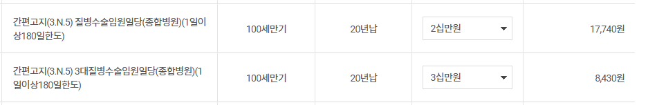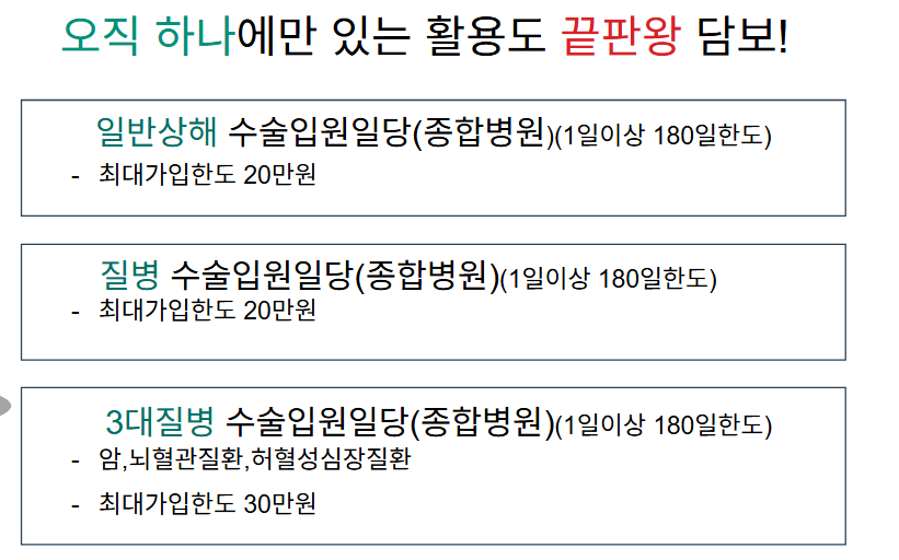 수술을 동반한 입원일 경우 보상된다는 조건을 고려하더라도 일일당 보장금액이 20만 원이라는 점은 매우 큰 장점이 있는 것은 분명합니다.