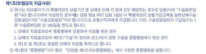 따라서 보장받는 내용은 간단합니다. 종합병원에 수술이 동반된 입원치료 시 보험금이 지급되는 유형이죠. 또한 종합병원이 아닌 일반 병원에서 수술을 받았더라도 그와 동일한 질병의 치료를 목적으로 종합병원에 옮겨서 입원하는 것도 보장이 가능합니다.