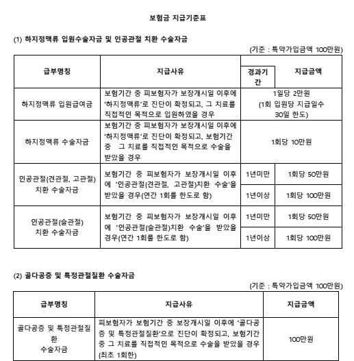 - 보장: 하지정맥류/인공관절치환/골다공증·관절질환 등