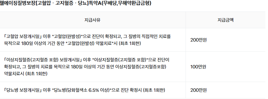 - 지급 기준: 고혈압/고지혈증 → 약물치료 180일 이상 · 당뇨 → HbA1c 6.5% 이상 진단 (약물 투약과 무관)