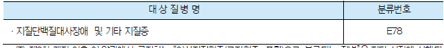 | 이상지질혈증(고지혈증 포함) | 경구용 약물치료 180일 이상 | 주성분 예: 스타틴, 에제티미브 등(예시) |