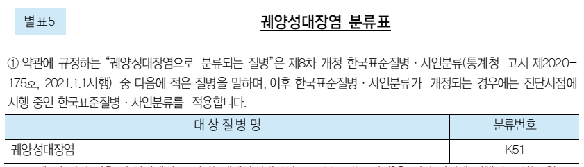 | 궤양성 대장염 | 약관 별표5 해당 진단 확정 | 내시경·조직검사 |