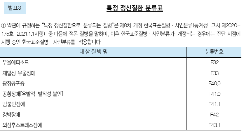 | 특정 정신질환 | 약관 별표3 해당 질병 진단 확정 | 진단서·진료기록 |