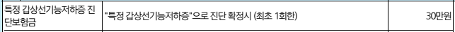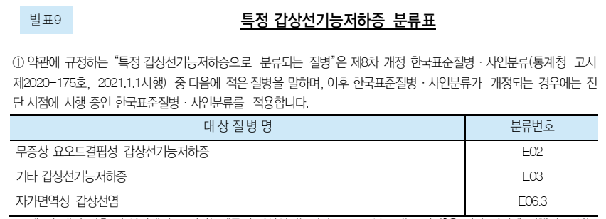 | 특정 갑상선기능저하증 | 약관 별표9 해당 진단 확정 | TSH/Free T4 등 |