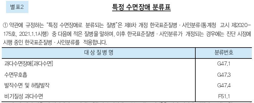 | 특정 수면장애 | 약관 별표2 해당 질병 진단 확정 | PSG/MSLT 등 수면검사 소견 |