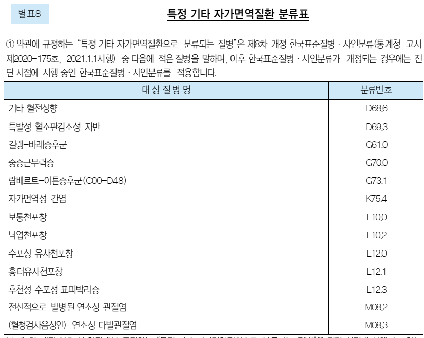 | 기타 자가면역질환 | 약관 별표8 해당 진단 확정 | 진단서·검사결과 |