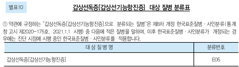 - 치료 요건: 갑상선절제술 또는 방사성요오드 치료 또는 항갑상선제 60일 이상 처방