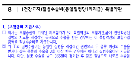 - 재수술 인정 주기: 매회지급형은 일부 수술에 60일 이내 재수술을 1회로 간주(그 외는 횟수 인정 가능). 동일질병형은 365일 경과 후 같은 질병의 새 수술을 별도 1회로 간주.