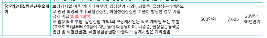 보장 범위는 충분히 괜찮은 편이며, 진단 + 수술을 함께 보장하는 점이 다소 일반적인 구성과는 다른 편입니다. 또한 20년납 100세 만기처럼 보이는 설계라도 실질적으로는 20년납 30년 만기로 만기 기간이 짧은 편에 속합니다. 해당 보장은 다음 단락의 건강리턴케어 특약과 함께 설계되는 선행 보장의 성격이 강합니다.