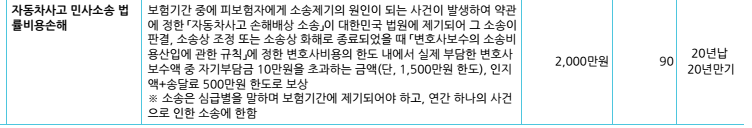 | 기타 면책 | 일반 교통사고 손해배상 소송 | 피보험자 고의/소송사기, 전쟁·내란·폭동, 지진·화산, 방사능, 노동쟁의, 가족 간 소송, 대표자·임원 업무 관련 소송 등 |
