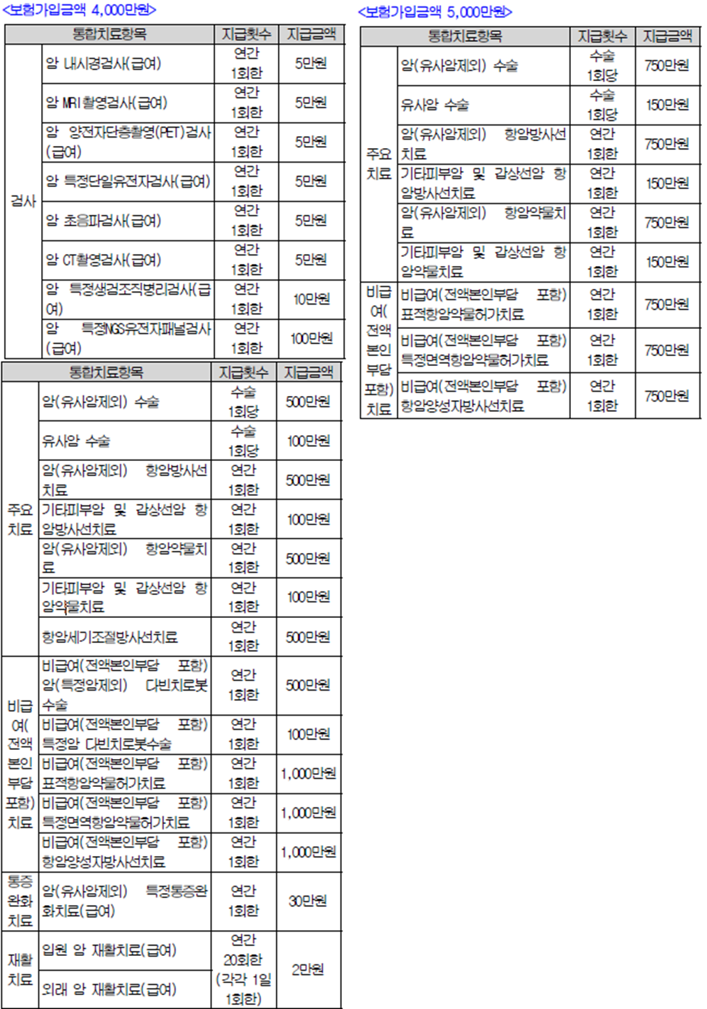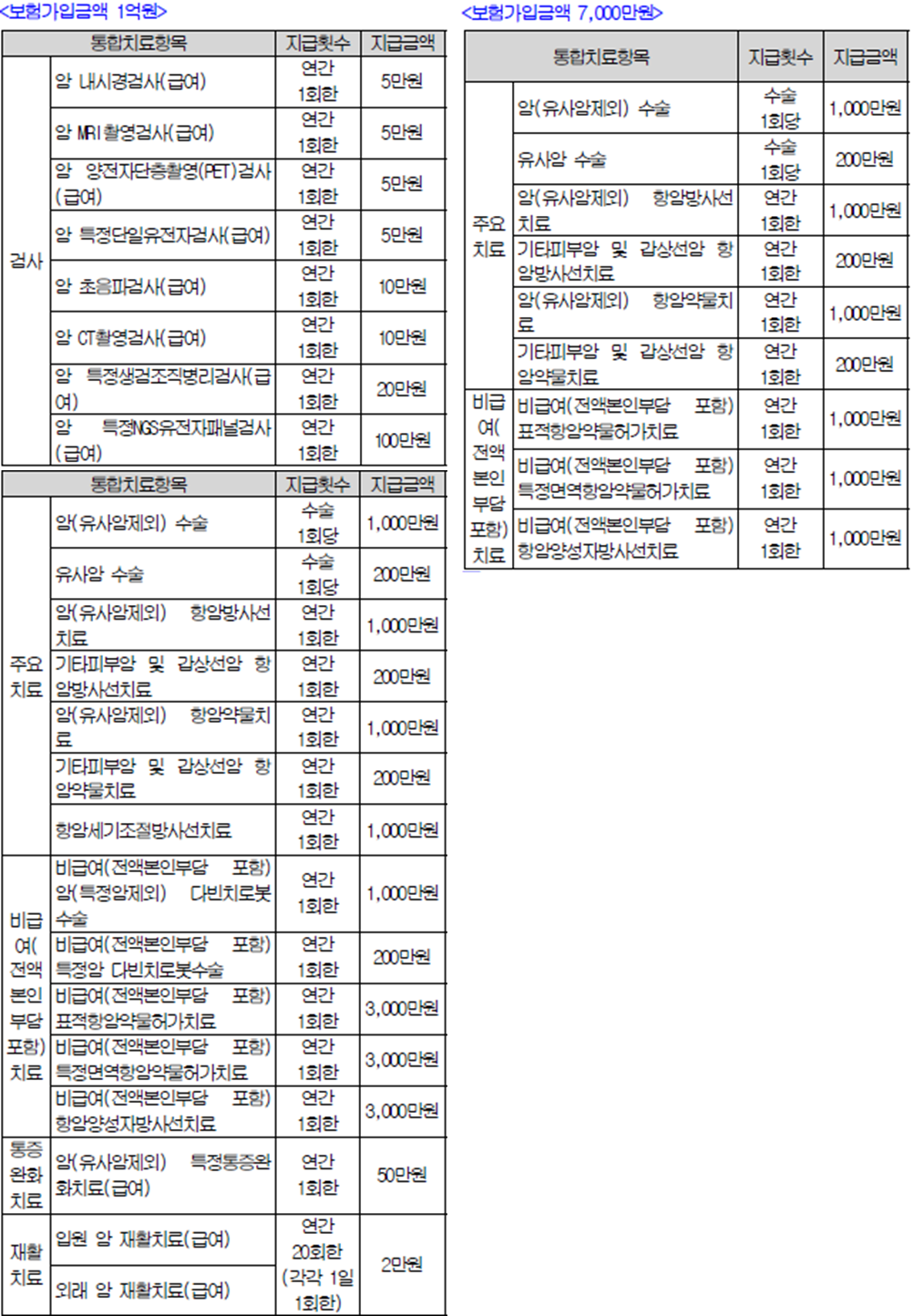 - 기본형 → 암 관련 ① 검사 ② 주요치료 ③ 비급여(전액본인부담 포함) 치료 ④ 재활치료를 통합 보장