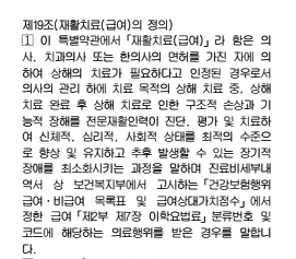 재활치료는 건강보험 급여 「제2부 제7장 이학요법료」 분류번호 및 코드에 해당하는 의료행위를 의미합니다. 예시는 아래 이미지를 참고하세요.