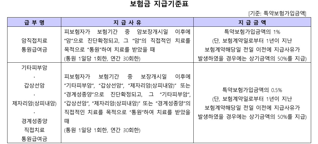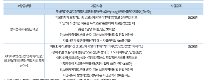 | 암직접치료 통원급여금 | 피보험자가 보험기간 중 암보장개시일 이후에 “암”으로 진단확정되고, 그 “암”의 직접적인 치료를 목적으로 “통원”하여 치료를 받았을때 (통원 1일당 1회한, 연간 30회한) 단, 보험계약일로부터 1년이 지난 보험계약해당일 전일 이전에 지급사유가 발생하였을 경우에는 지급금액의 50%를 지급 |