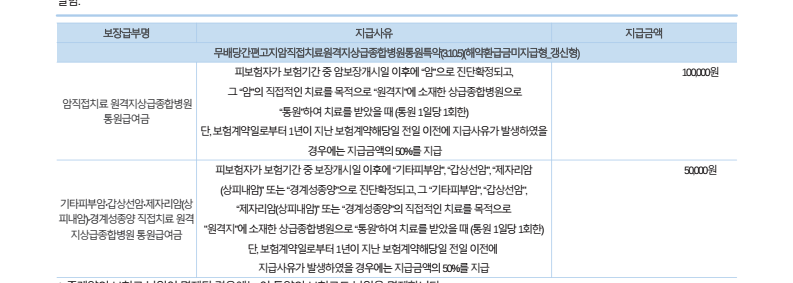 | 암직접치료 원격지 통원급여금 | 피보험자가 보험기간 중 암보장개시일 이후에 “암”으로 진단확정되고, 그 “암”의 직접적인 치료를 목적으로 “원격지”에 소재한 의료기관으로 “통원”하여 치료를 받았을 때 (통원 1일당 1회한, 연간 30회한) 단, 보험계약일로부터 1년이 지난 보험계약해당일 전일 이전에 지급사유가 발생하였을 경우에는 지급금액의 50%를 지급 |
