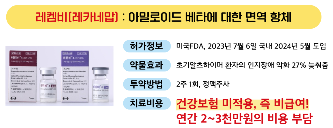 레켐비는 건강보험이 적용되지않고 지속적으로 약을 투약해야합니다. 비급여다보니 1년동안 계속해서 투약한다면 연간 2~3천만원의 비용이 부담됩니다.
