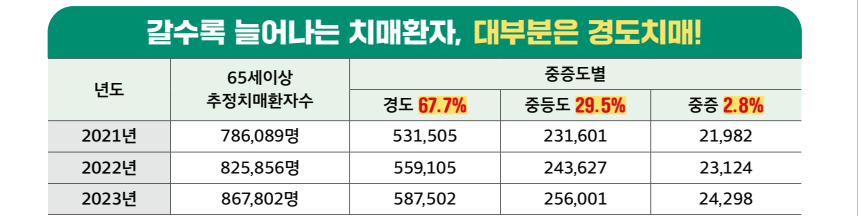 치매환자는 대부분 현재 경도환자가 대부분으로 전체 치매환자중 경도부분은 약 68%정도이고 중등도가 30%이고 중증은 약 2.8%수준으로 매우 환자수가 적은편입니다.