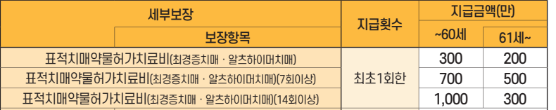- 치매특정약물치료(급여) : 치매특정약물(급여)을 처방 받은 경우(연간 1회한)[※ 지급금액 : 50만원]