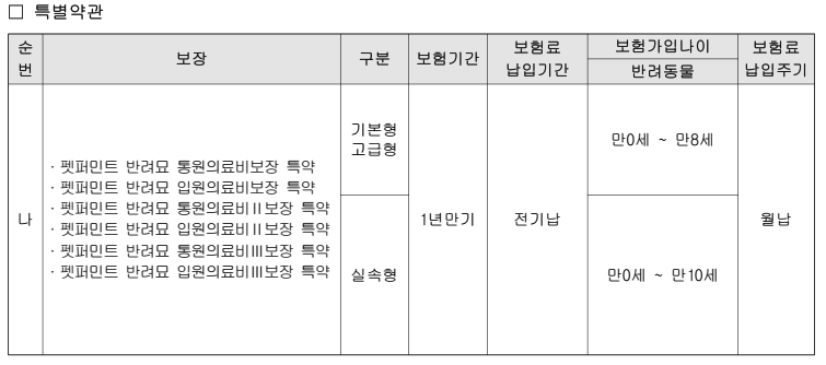 고급형, 기본형, 실속형 3가지가 존재하고 선택해서 가입을 하는데요. 3가지의 차이점은 좀 더 뒤로 미뤄두고 반려견이나 반려묘가 만 8세보다 나이가 많고 만 10세 이하라면 메리츠 펫보험에서는 선택지가 실속형 뿐이라는 점이 중요합니다.