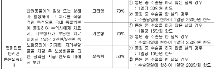 반려동물이 아프거나 다쳐서 병원에 가면 치료 목적의 통원이나 입원에 대해 자기 부담금(1일 3만 원 또는 5만 원)을 빼고, 그 나머지를 고급형·기본형은 70% 실속형은 50%이 비율로 내가 쓴 돈에서 보상해 주는 구조예요.