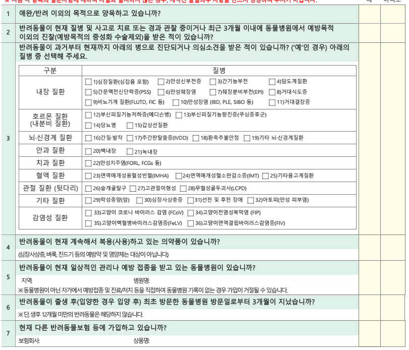 7. 현재 다른 반려동물보험 등에 가입하고 있습니까? (예, 아니오)