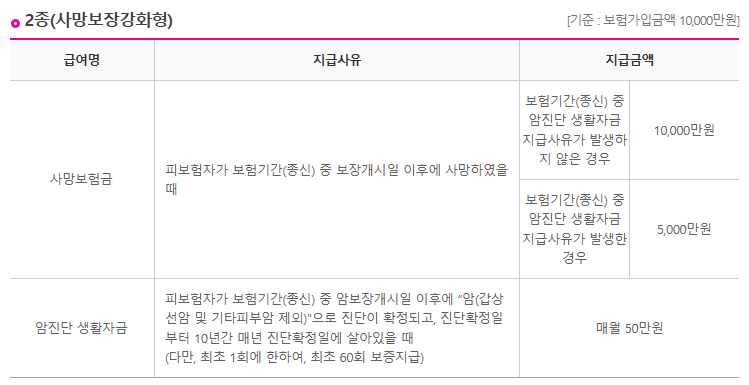 이 유형은 사망보험금 가입금액을 더 크게 가져갈 수 있고(예: 2억원까지),