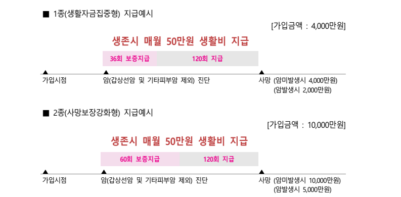그리고 여기서 중요한 게 보증지급입니다. 암 진단 후 얼마 지나지 않아 사망하더라도, 생활자금 집중형은 36회(36개월)까지는 보증지급이 들어갑니다.