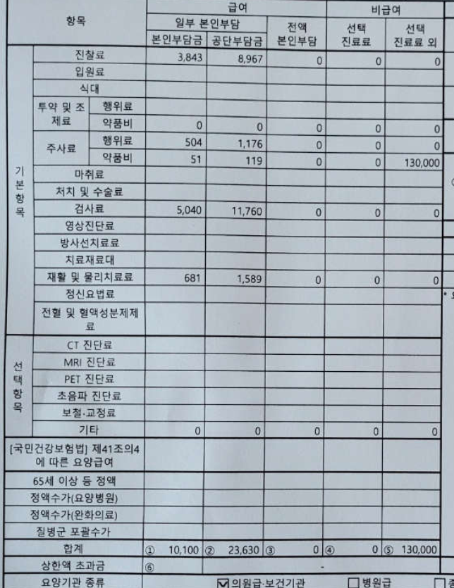 진료비영수증에서는 실비청구 시 첫 번째로 필요한 서류입니다. 보시면 급여항목에서 10100원을 지출하였고 비급여에서 13만 원의 비용이 발생했는데요. 이렇게 비급여가 발생한다면 진료비 세부내역서가 필요하게 되는 것입니다.