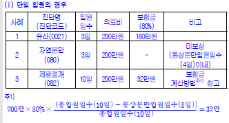 | 사례 | 진단명 | 입원일수 | 의료비용 | 보험금(80%) | 비고 |